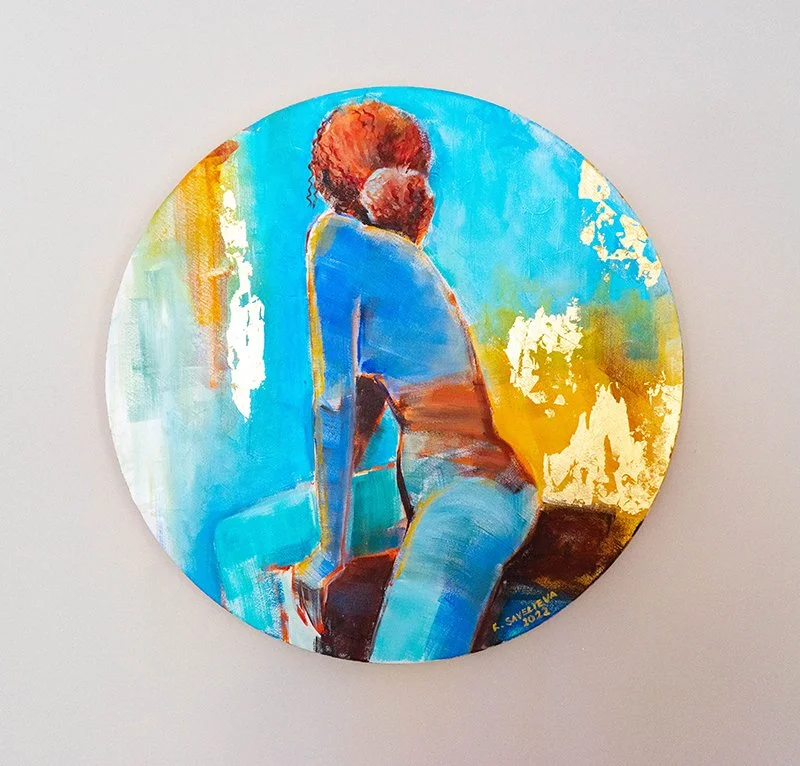Grace in gold. Oil, acrylic, gold leaf on round 20" canvas ($600 CA)